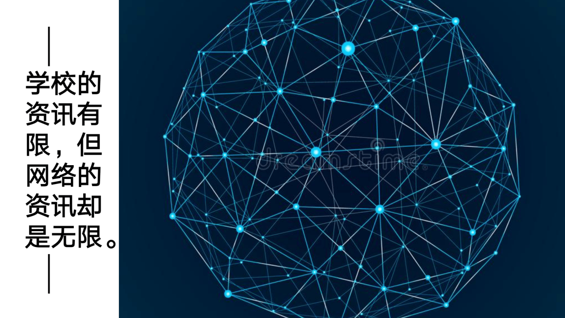 学校给的知识有限,但网络里的知识却是无限。在以前,无论你都多么努力学习,只要没钱去学校,就什么也都学不到。如今,只要肯努力学习,善用网络,那么我们懂的东西,甚至可能比教授还懂得多。当然,单单透过网络学习是不够的,还必须时常与不同的人交流与切磋,否则会很容易自满并钻牛角尖。