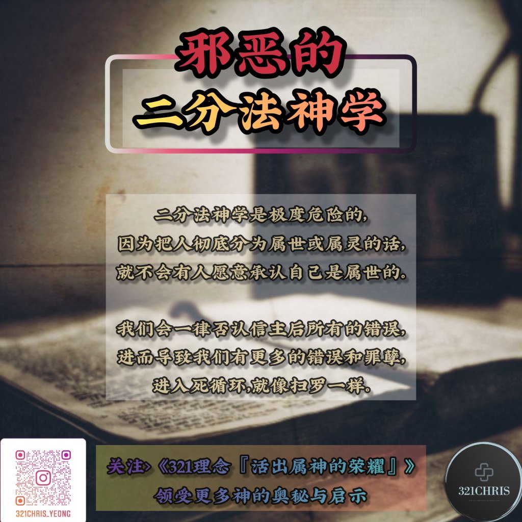 有些神学思想无伤大雅,真的不需要太介意对或错,但对于上述这种二分法神学,是绝对要杜绝的!要知道,认罪悔改,永远都是我们要学习的功课。(参撒母耳记上)
