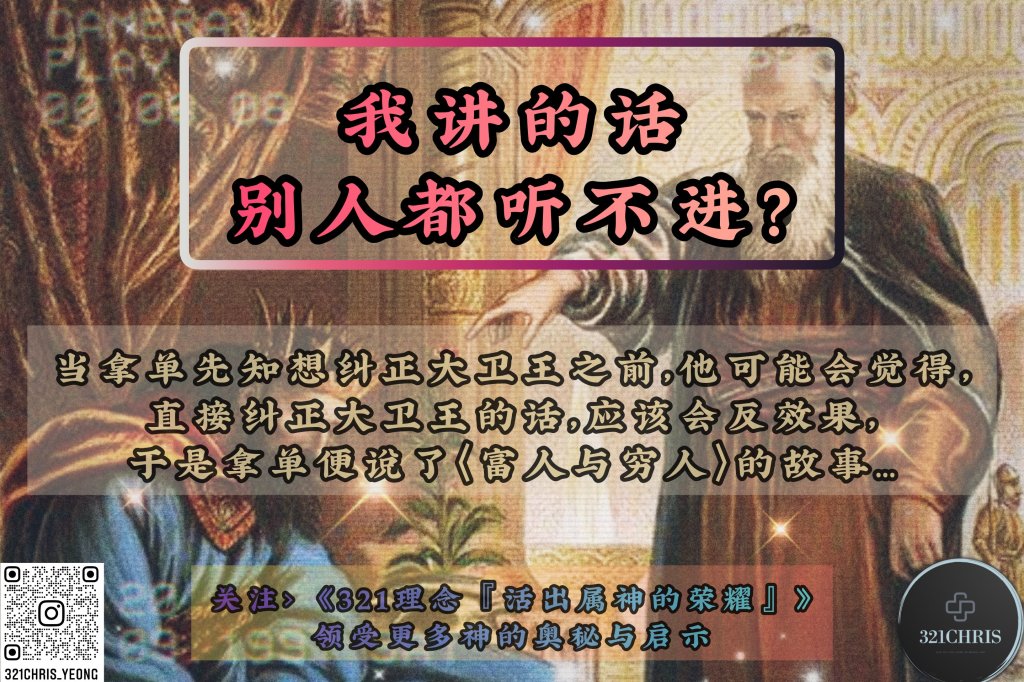 「镜头换去大卫的“拔示巴事件”」:当拿单先知想纠正大卫王之前,他可能也会觉得,直接纠正大卫王的话,应该会反效果,于是拿单便说了⟨富人与穷人⟩的故事,让大卫产生情绪和代入感。当大卫愤怒地斥责富人时,拿单便告诉大卫王说:“你就是那人”。然后大卫就认罪悔改了。