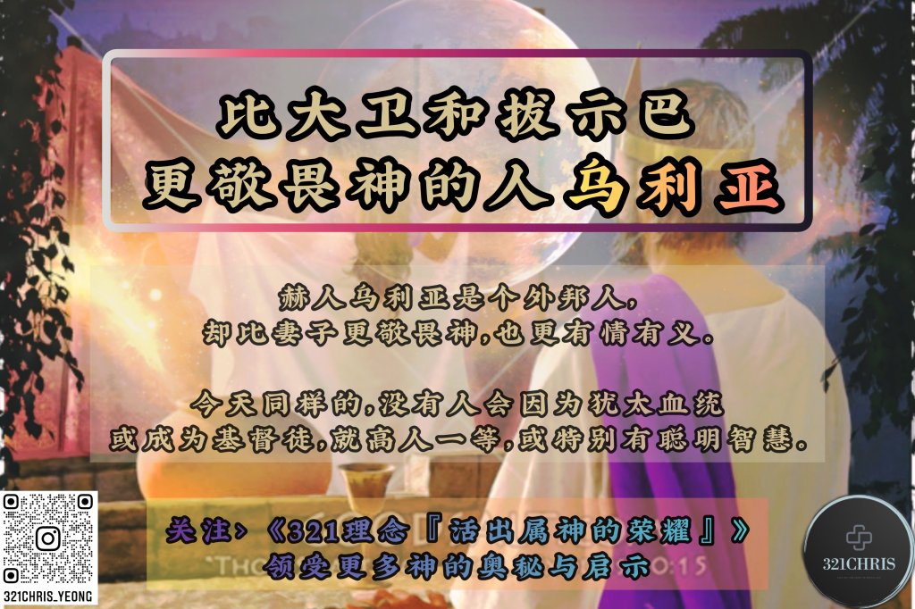 今天当我们像乌利亚一样敬畏神时,不要以为就会事事顺利。同样的一个心态,可能会像约瑟那样步步高升,也可能会像约伯那样上上下下,更可能会像乌利亚那样直接跌落谷底。