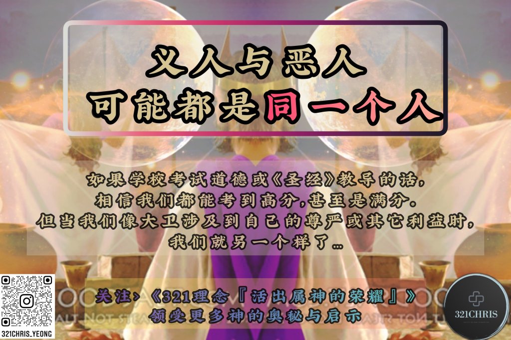 如果学校考试道德或《圣经》教导的话,相信我们都能考到高分,甚至是满分。但当我们像大卫涉及到自己的尊严或其它利益时,我们就会设法让自己成为个好人,或保住自己的面子、权力、饭碗等…,却反而让自己变得越来越坏。