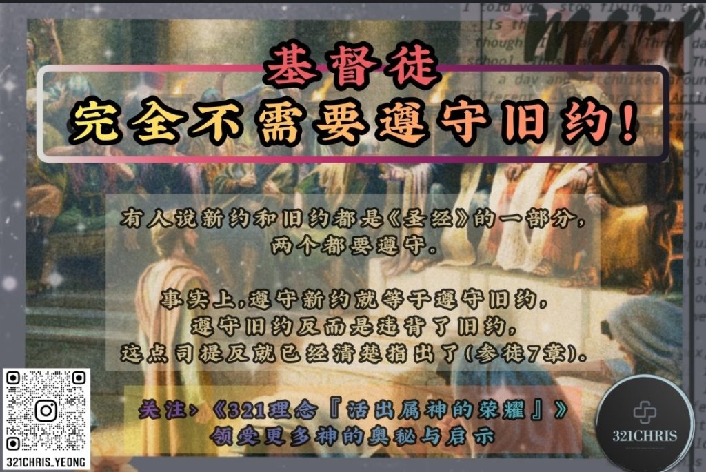 可能会有人说,新约和旧约都是《圣经》的一部分,两个都要遵守。事实上,遵守新约就等于遵守旧约,遵守旧约反而是违背了旧约,这点司提反就已经清楚指出了(参徒7章)。要知道,旧约的存在,本是预备新约的出现。旧约只是预表、是影子,新约才是本体。
