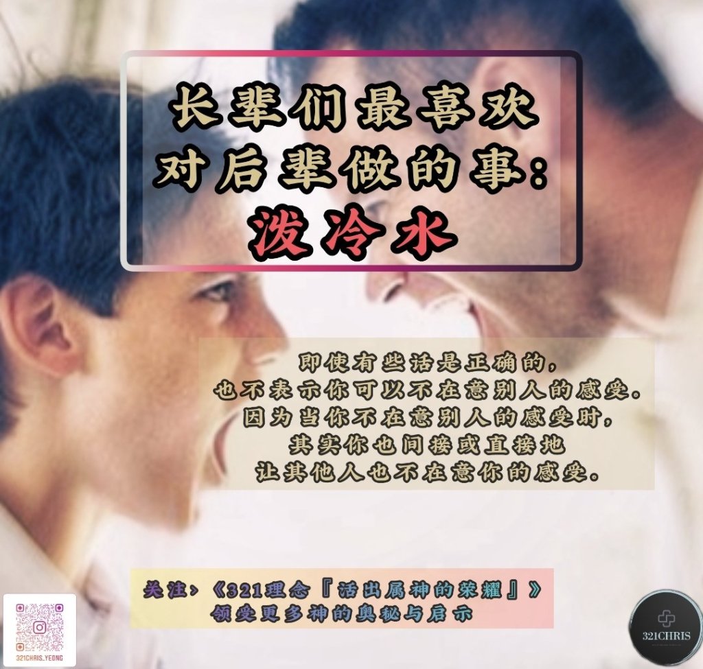 讲到泼冷水,这让我联想我自己的亲身亲历。还记得我15岁左右,想要出去兼职工作,就被爸爸说:“你做不久的啦,你看,最多可以做两三个月而已。”结果我一做就是几年兼职,最短的那间公司,至少也有一年左右。直到我信主之后,想要热心服事,读神学,结果又被自己教会的长老泼冷水,说:“做牧师没有那么容易的,你应该先出去工作拿经验。”虽然我现在回头看这一句话“工作拿经验”是很有道理,但当时我是灰心和愤怒的。