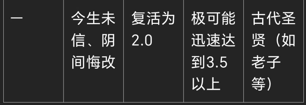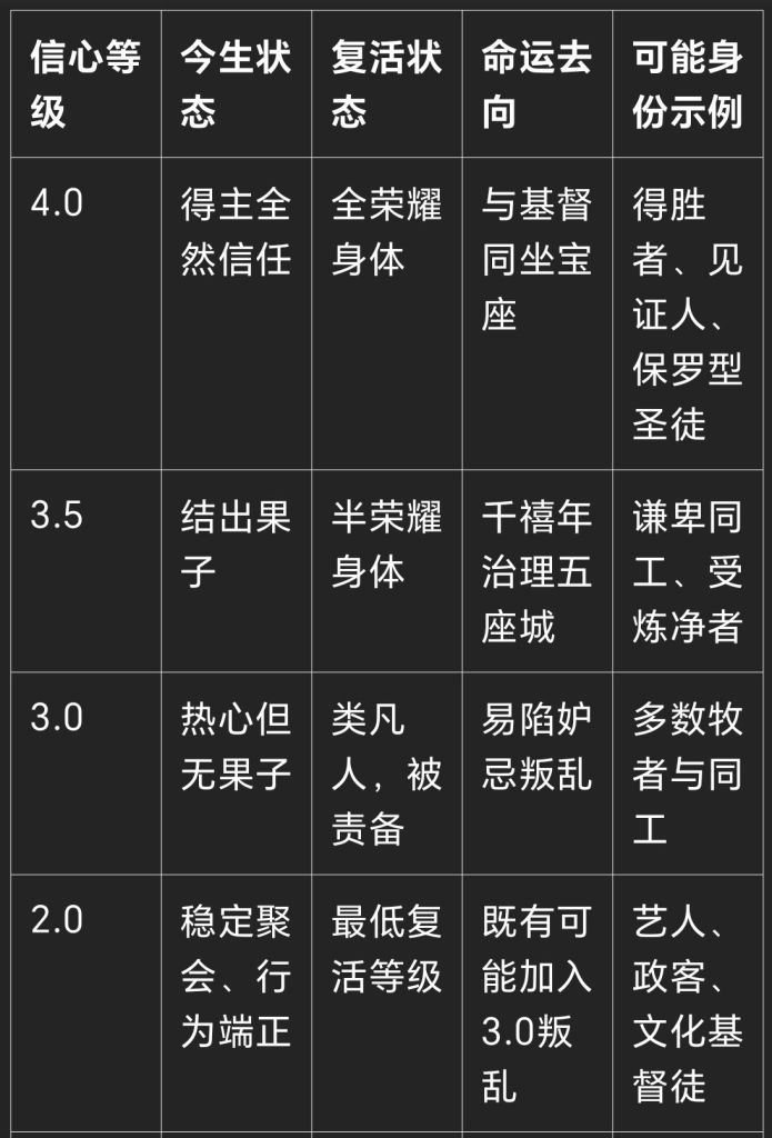 包括信心4.0的得胜者与今生信主但未得胜的2.0~3.5;其中2.0者多为今生稳定聚会、行为端正者,如艺人、政客、文化基督徒。阴间信主者将以2.0的状态复活,与凡人一起接受神国律法的训练。