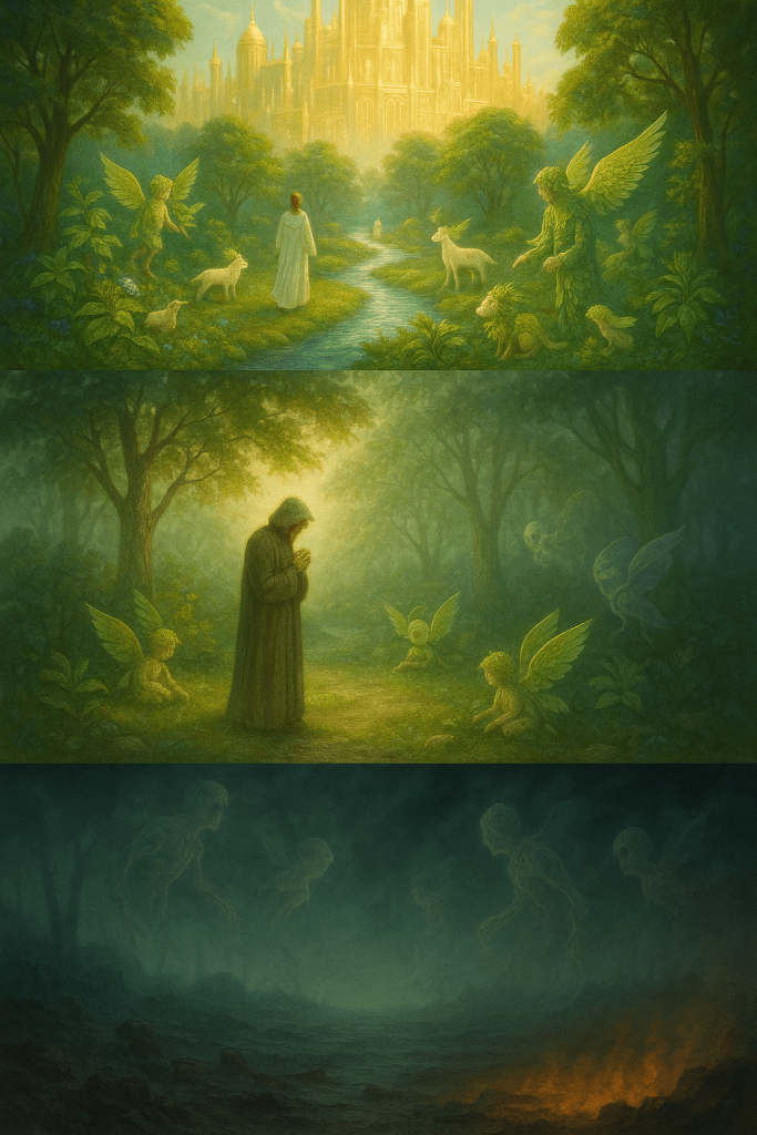 但圣经给出第三种光照: 上帝设立一个荣耀秩序,在其中布置小天使群体,让他们隐藏在动植物、山川、甚至人造物中,服事人类、回应神的治理。