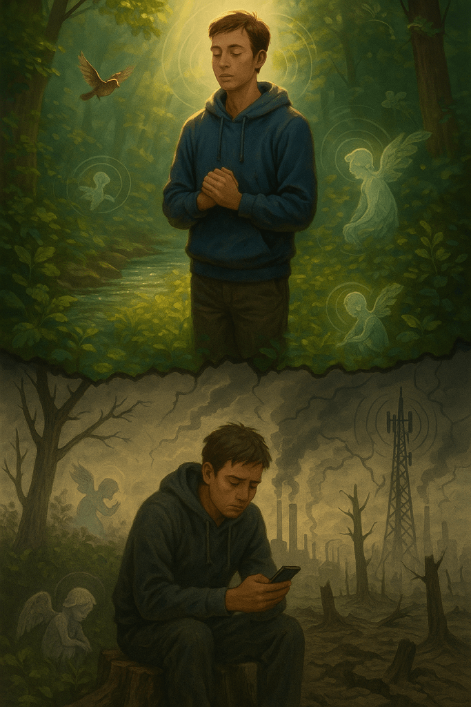 森林不再低语,土地不再共鸣,风中失去了抚慰的频率,树木不再遮蔽心灵的焦躁。一切看似自然荒凉,其实背后是属灵秩序被截断的后果。