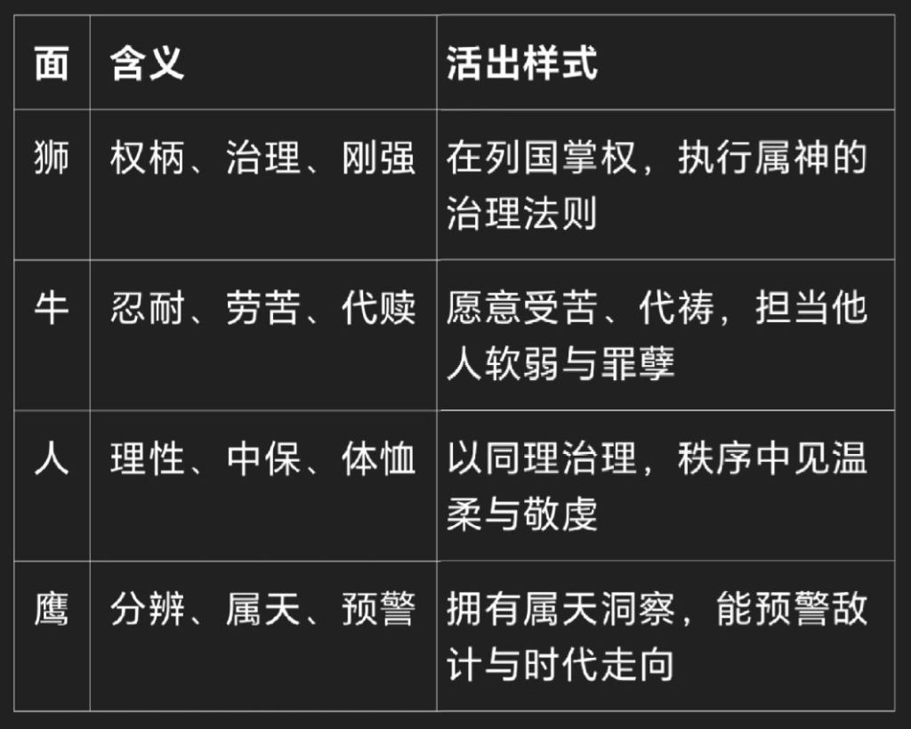 狮、牛、人、鹰,不仅彰显耶和华的荣耀与威严,亦是基督四属性的具象预表,更是未来千禧年中,得胜者逐步活出的成熟路径。